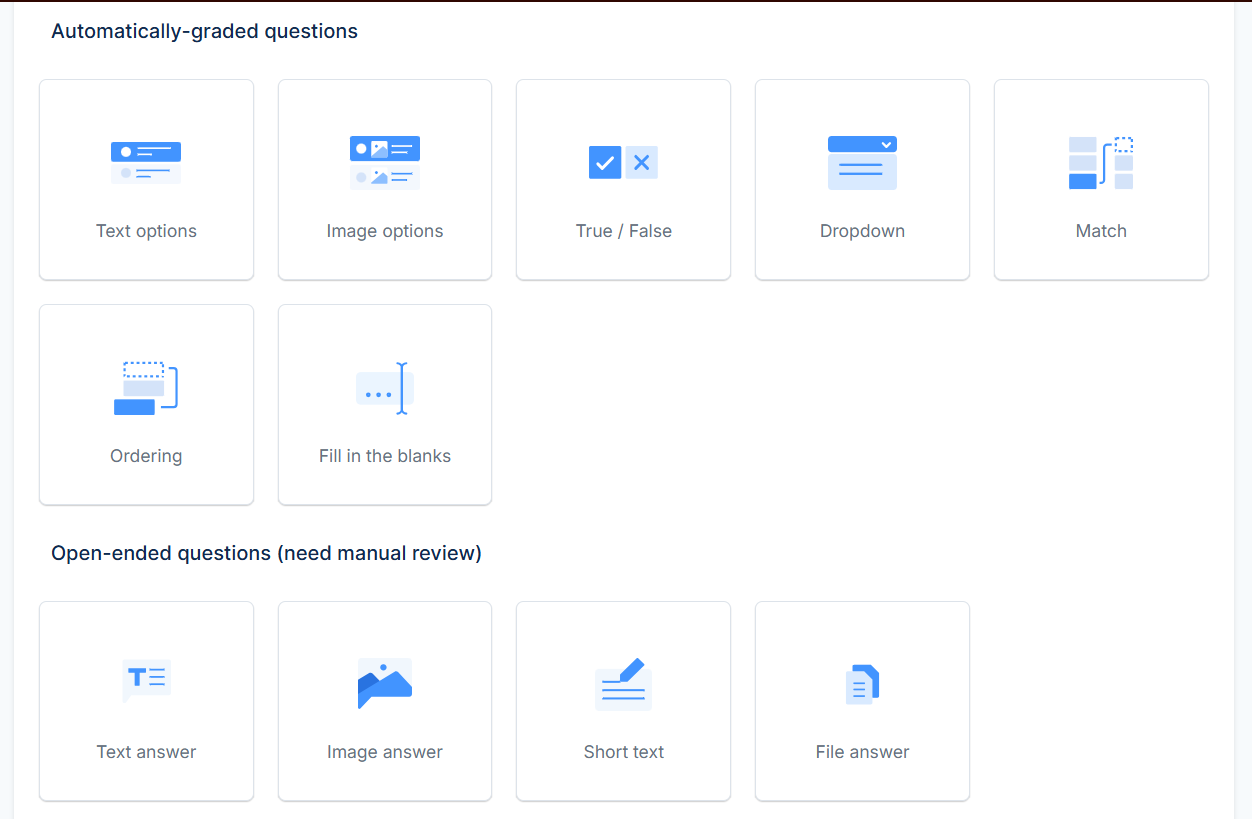 To create your questions, click the Create Question button and select your question type. There are 11 types of questions under the assessments. 7 of these questions are automatically graded by the platform when your students submit their assessments, while the remaining 4 are manually reviewed and graded by you.