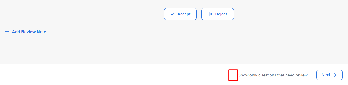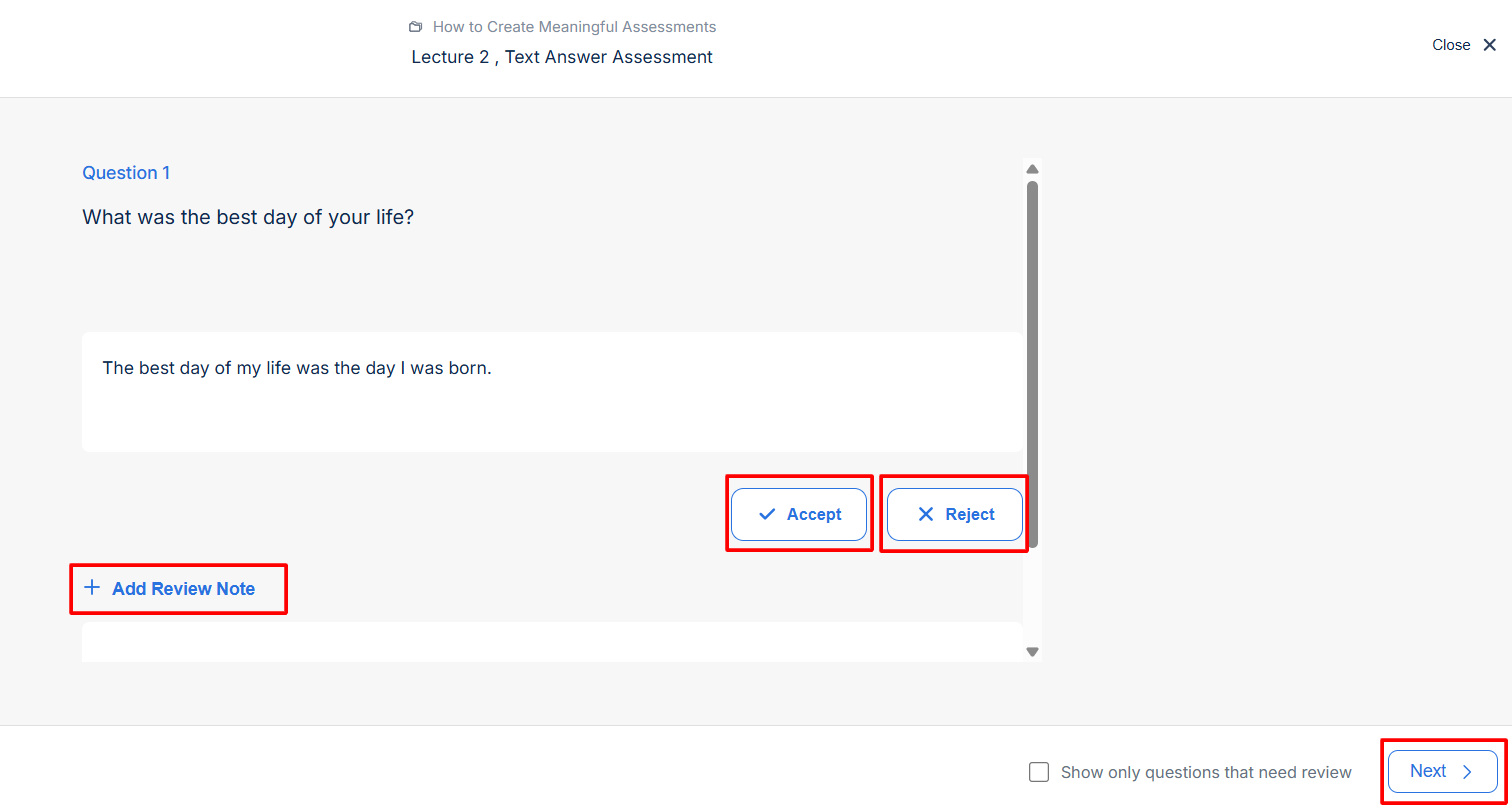 To review an assessment, click Review in front of the assessment. On the next page, go through the student's answer, approve or reject it, add a review note (this is optional), and click next to move to the next assessment.