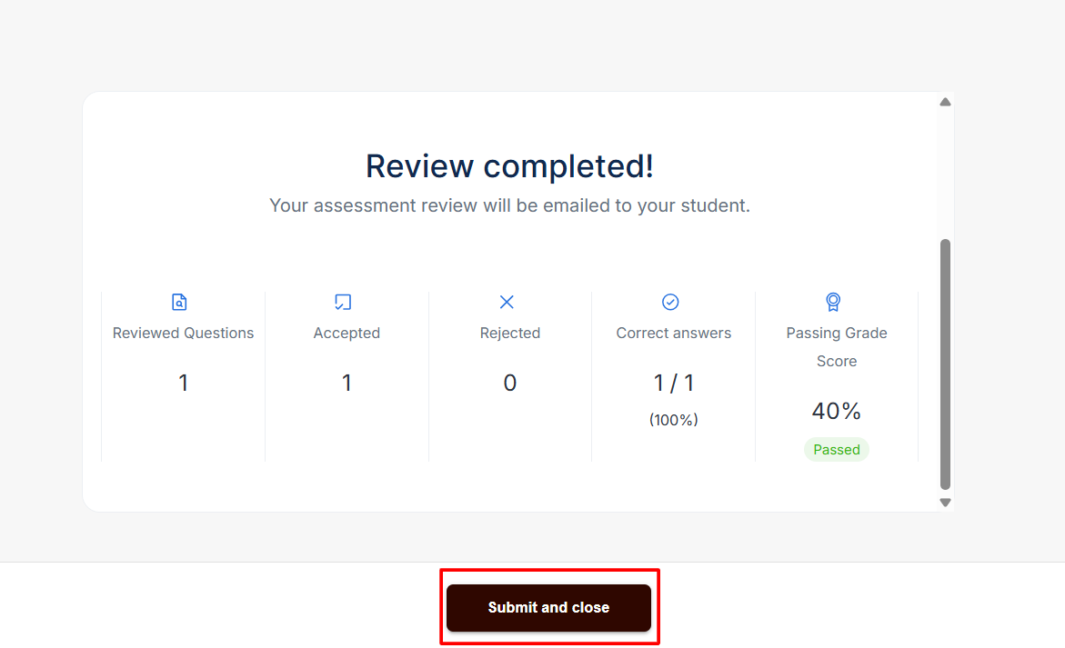 When you are done reviewing all the assessments, you will get a detailed view of your student's score. Then, submit and close the screen. Afterward, your students will receive an email of your review. This email can be edited by you under the Email Templates.