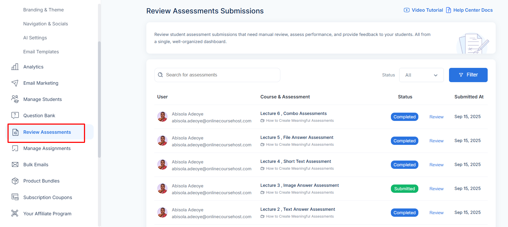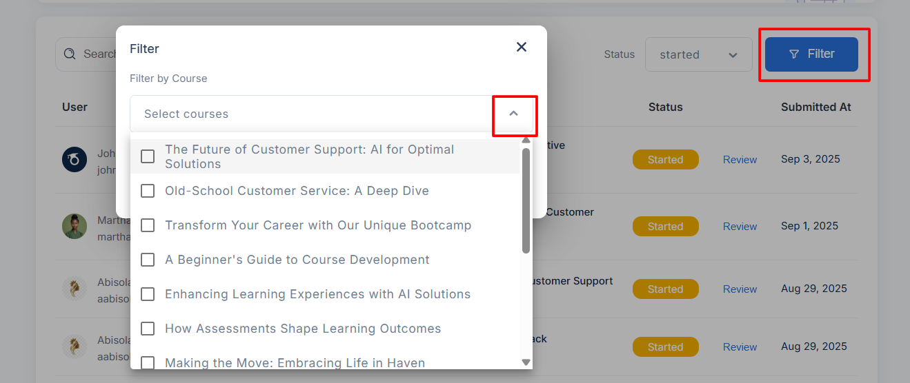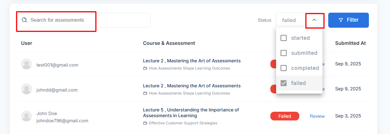You can also filter your assessments according to your courses, and search for each assessment using the search bar.