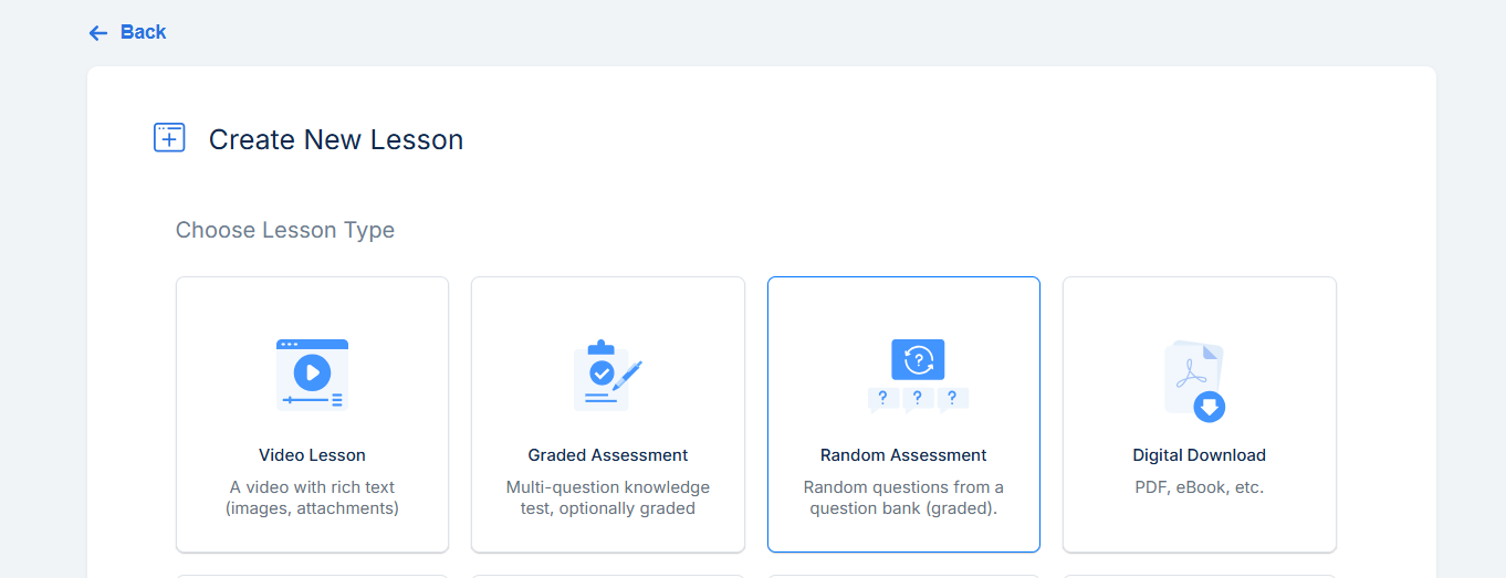 You can also click Edit on any existing product => Add Lesson => and select the Random Assessment option.