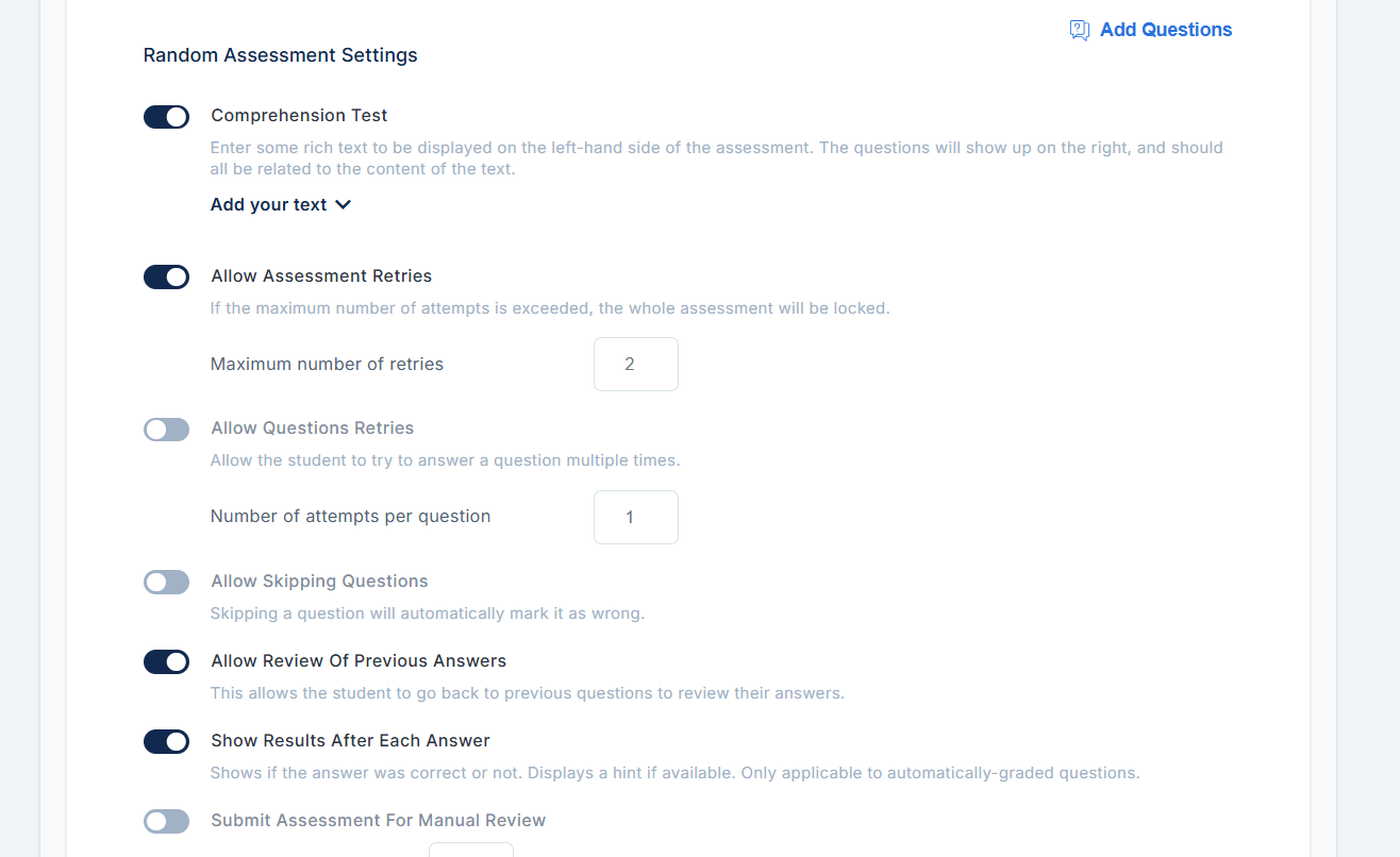 - Number of Questions: This is compulsory, as you need to add the number of questions that your students must answer under the assessment.