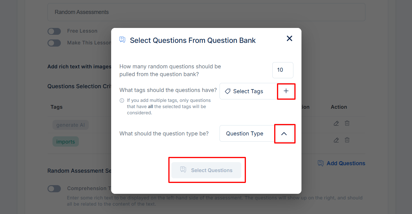 Note: If you select more than one tag, the system will only look into and pull questions that have all these tags in them.