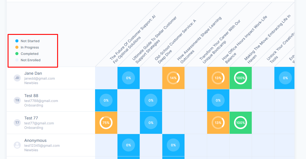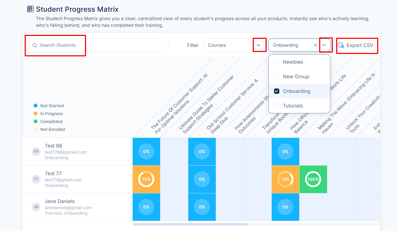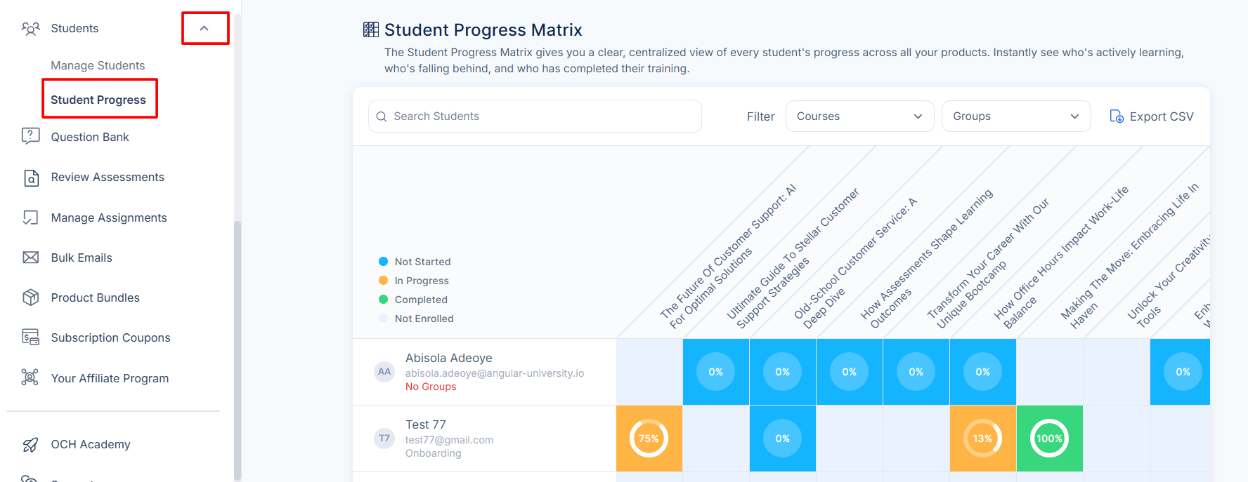 Here, you get an overview of all the students on your platform and your courses. You also get to see the status of each student under each course.