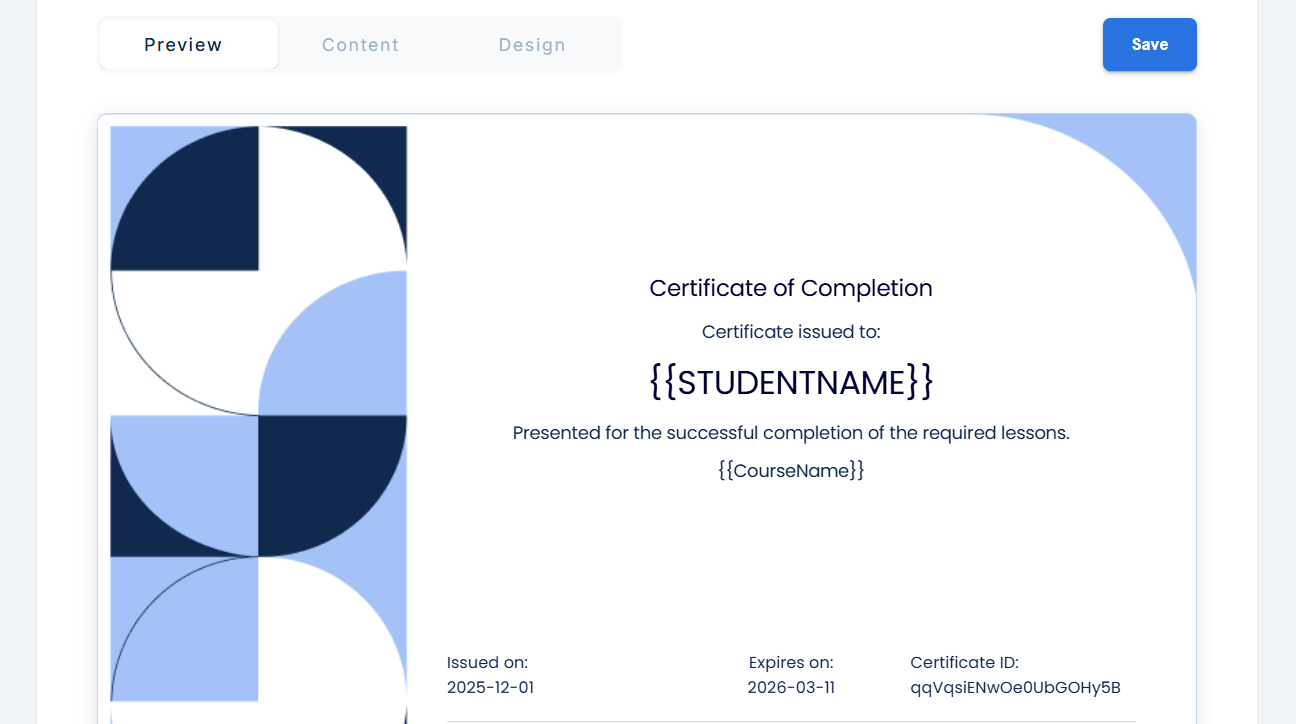 - Issued On: This automatically comes in the date you are currently designing your certificate, but when you use a placeholder like {{IssuedOn}}, it is automatically replaced with the date your student completes their course for the first time/generates their certificate for the first time.