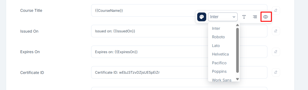 For each field under the content screen, you can change the color, font, text formatting, justification, and hide it from the certificate.
