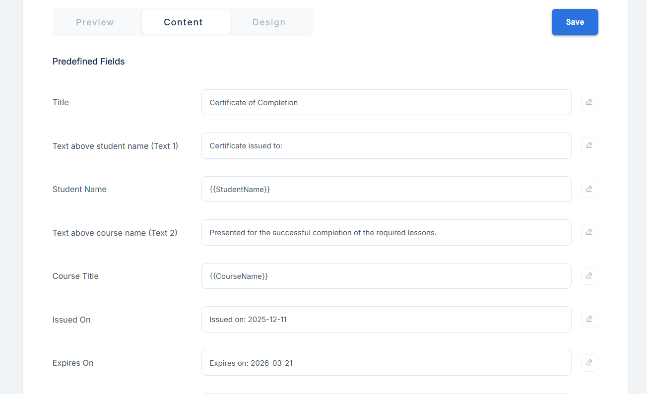 The Content Screen is where you edit the predefined fields that come with the certificate and add your own custom fields. The predefined fields are: