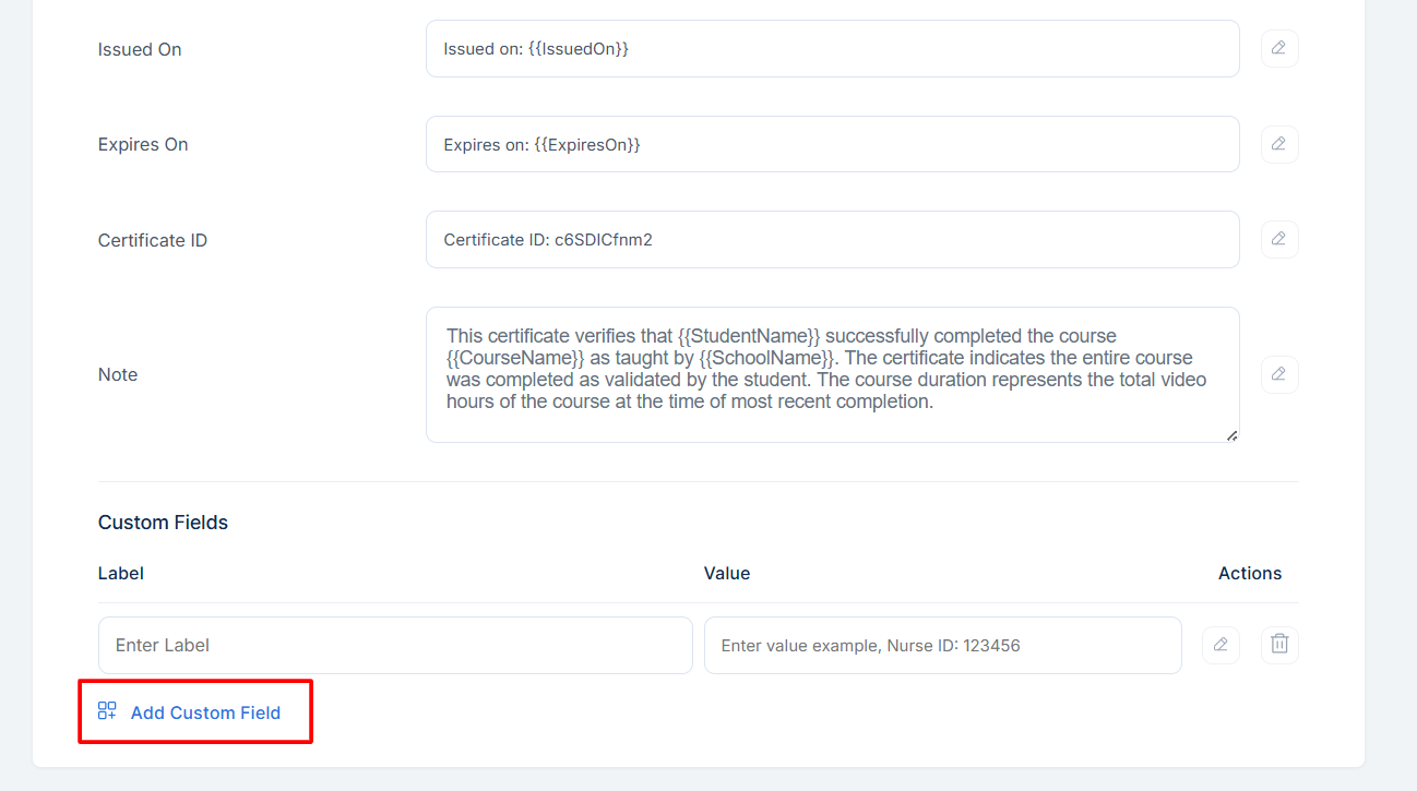 - Custom Fields: Here, you can add up to three custom fields, and it depends on what you want to add to your certificate. Depending on the design template you choose, custom fields will either be displayed beneath the course title or certificate ID.