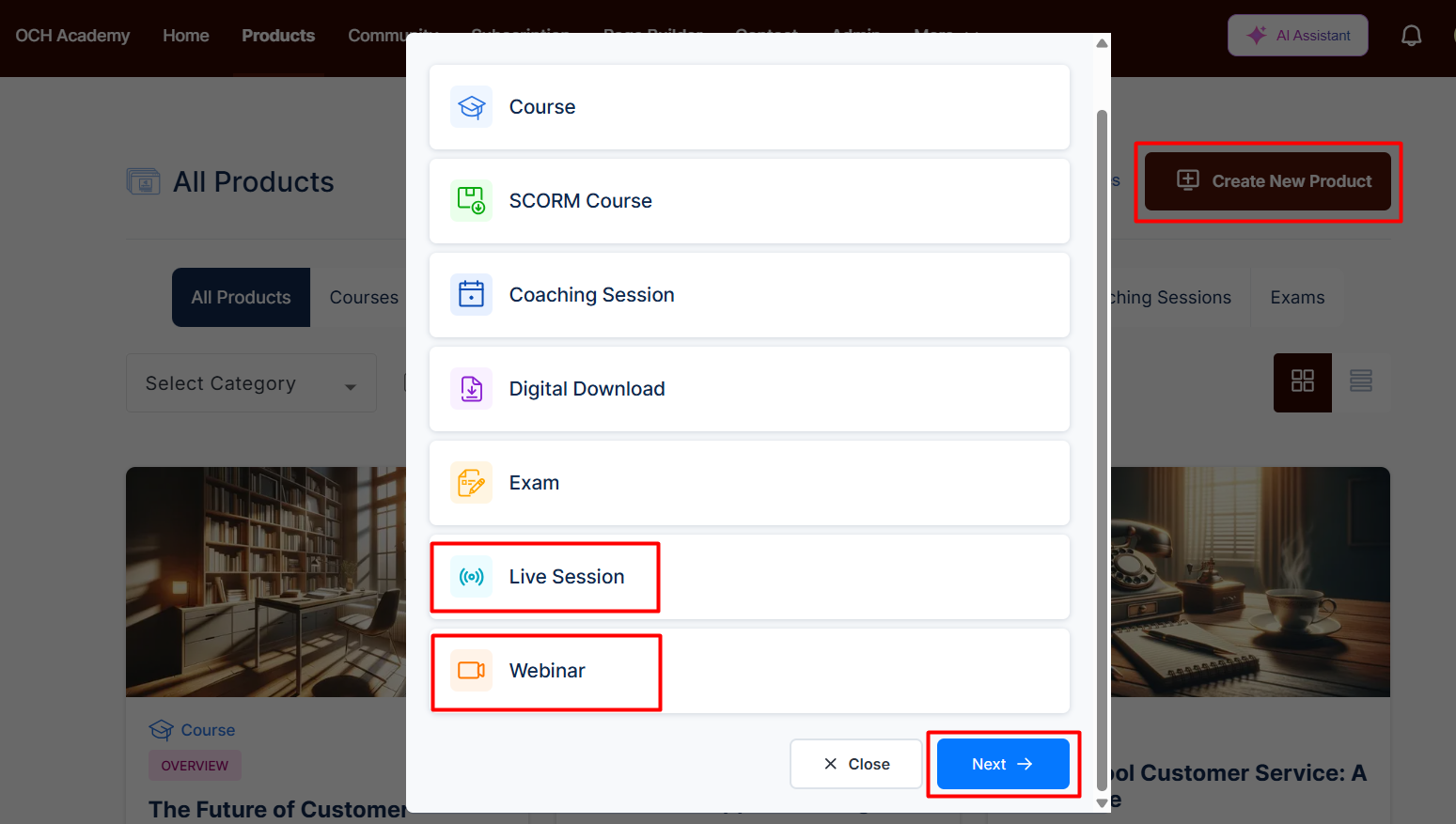 To get started, log in to your course platform, click Products => Create New Product => click Live Session or Webinar => click Next, and continue creating the product.