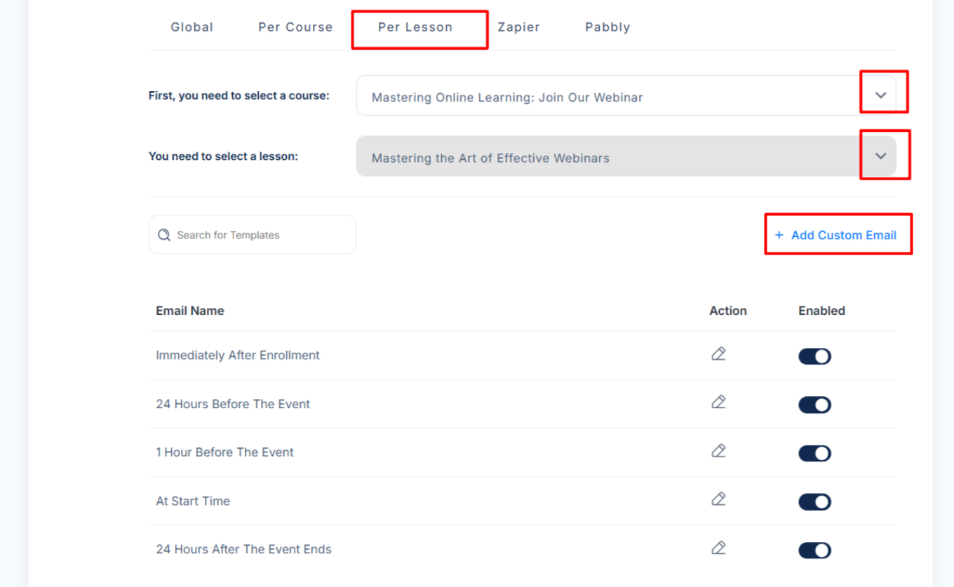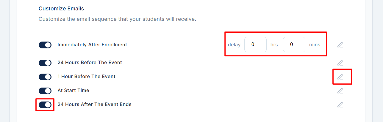 Here, you can customize the emails that your students will receive regarding the live session or Webinar. There are 5 emails in total, and they are enabled by default.