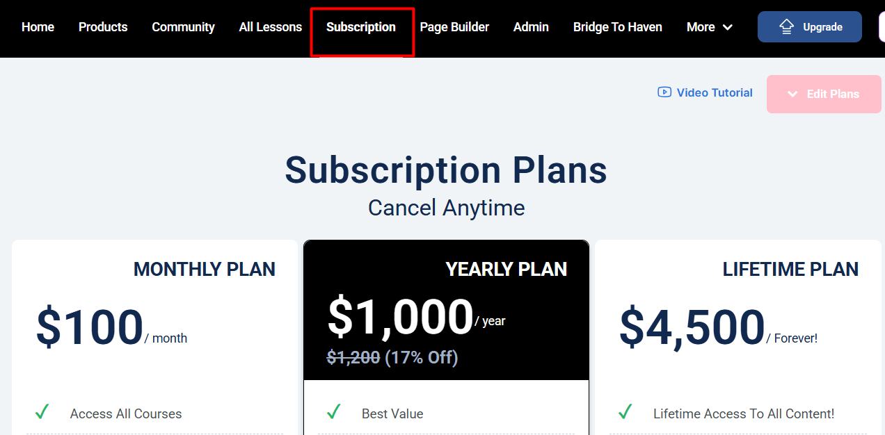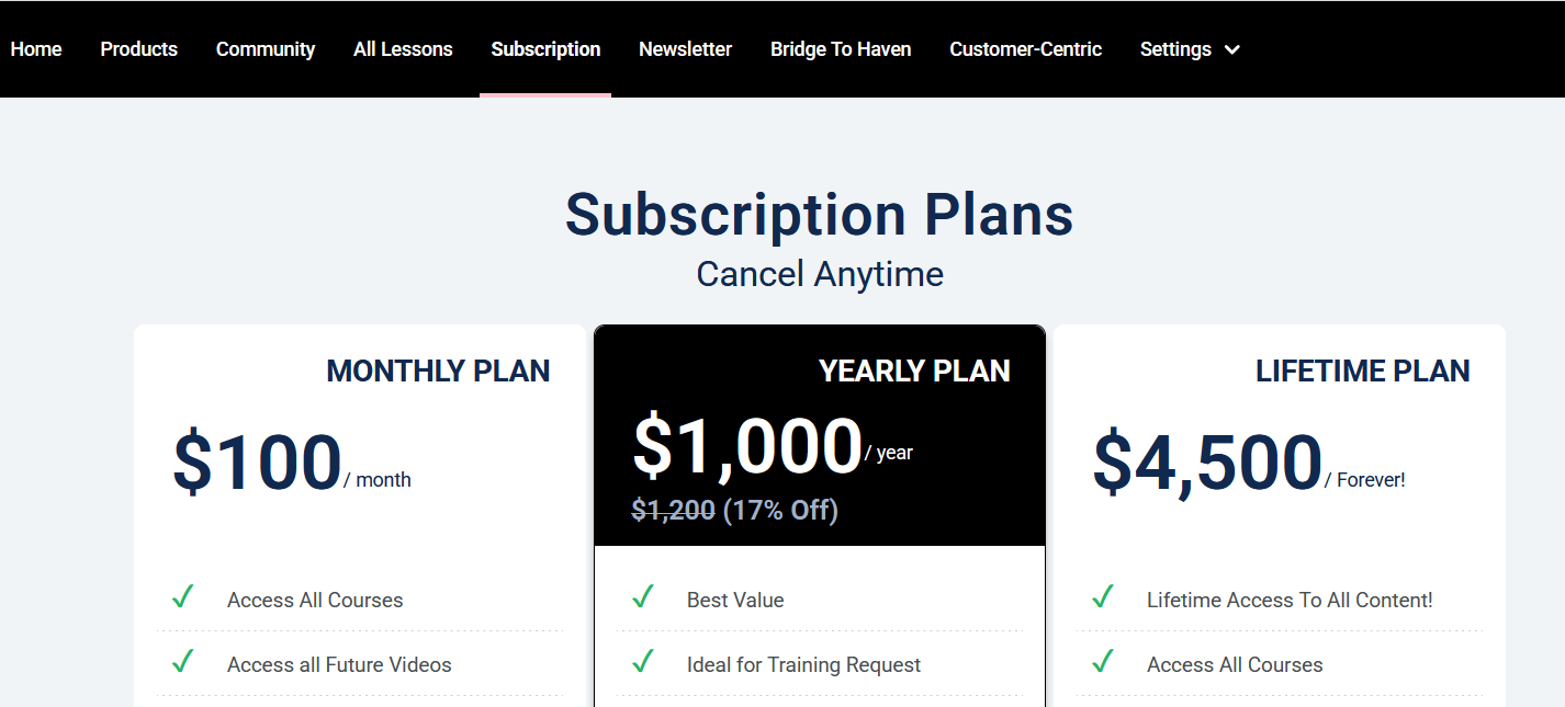 2. Yearly Plan: Just like the monthly plan, this plan gives your subscribers access to all your courses and is charged every year. The access to your content is revoked if the user does not renew their subscription plan after one year.