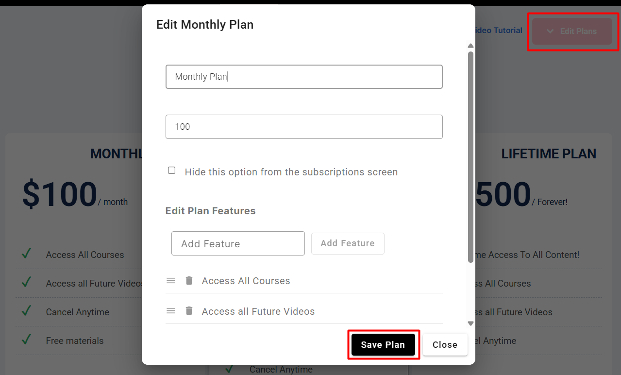 - Proceed to fill in the Title of the plan, the price of the plan, and the plan features.